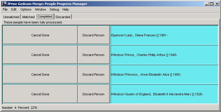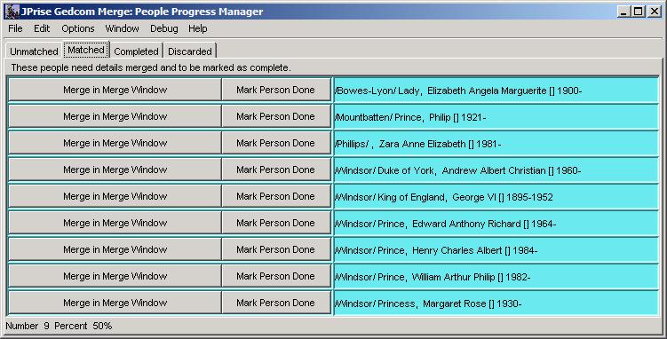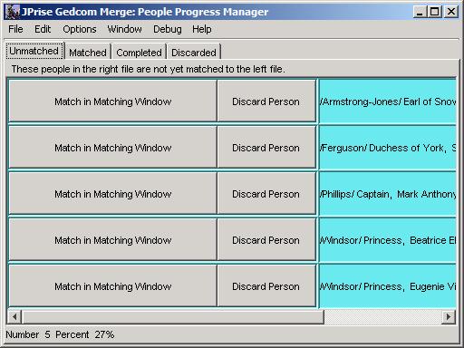 Note: To remove the matching indication on an individual, use the Matching Window. To focus the Matching Window on an individual which has already been marked as matched, click on the "Merge in Merge Window" button and that will both bring up the Three Pane Merge Window and also refocus the Matching Window on the same individual. You can then go to the Matching Window and right-click on the individual you wish to un-match, and a pop-up menu will allow you to remove the match(es) you wish. The People Progress Manager Window's panels will update accordingly. TBD - A button will be added here to also un-match an individual.