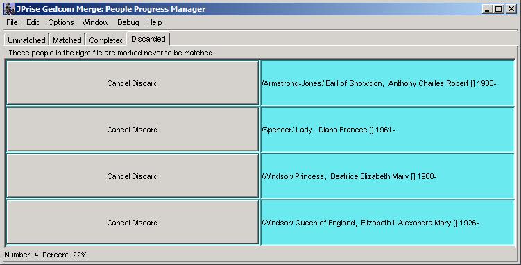 The Discarded People Panel displays a list of individuals, from the merge source file, which have been marked as discarded. A discarded person is one that you have decided not to consider further. It is effectively completed, even though you may not have gotten any information from it.To the right of each individual shown in this list, you will find a button labeled "Cancel Discard " . Clicking the "Cancel Discard" button will remove the individual from the Discarded People Panel and move that individual back to either the Unmatched People Panel or the Completed People Panel from which is was previously discarded.