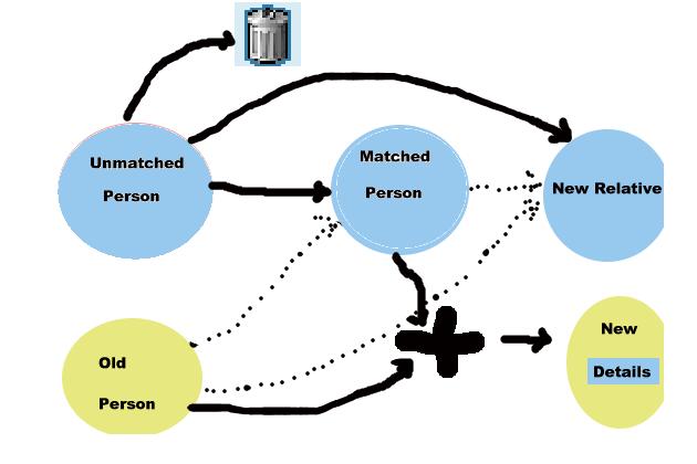 Upon first defining and opening a new project (see Getting Started -- files and concepts) JPriseMerge will "mark" and display every individual from the merge source file as unmatched, and present them to you in the Unmatched People Panel. (Keep in mind that JPriseMerge will initialize your merge output file with all the data from your base file.) The first step in doing a merge is to choose an individual from the merge source file to work with, and try and match up that individual with an existing individual in the merge output file, if such an individual does indeed exist there. If not, then you may decide to either add the into the merge output file, as a new relative of another individual that exists in the merge output file, or you may decide to deferr or discard working with that individual..