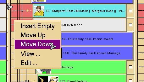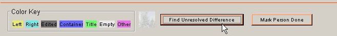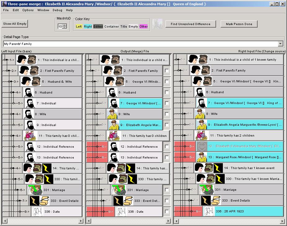 To understand why user intervention is sometimes necessary to help out with alignment of data panels, lets look at a couple of scenarios. Lets say we are wanting to merge in children of a family, for example. The base file shows the family has one child, David, and the merge source file also shows this family has one child Sara. Both of these source data bases are incomplete because in actual fact the family has two children. JPriseMerge has no way of KNOWING this ahead of time, so when it displays the Three Pane Merge window for this family, it will only show the family as having one child. And that since they are different it will indicate that this needs to be resolved. Therefore the two child data panels will initially be in alignment with each other. Clicking on Sara to merge her into the middle merge output file would result in an unsatisfactory solution since that would not add Sara, but replace David with Sara. So, to get around this, we need to add an empty data panel above David, in the middle column for the merge output file. When the empty panel is added, above David's panel, JPriseMerge will also automatically add empty panels into the columns for the base file, and merge source file, so as to keep the alignments correct. However, it still may not get it exactly right, and we may have to use the Move Up or Move Down buttons so as to align all the "David panels" up with each other, and the "Sara panel" up with the new empty data panel. Once we have accomplished that, then Sara can be merge in, to replace the empty data panel in the middle column, just like any other merge operation.