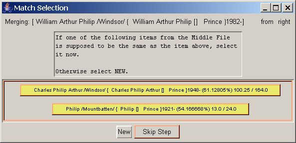 There are many kinds of data that are stored in GEDCOM files such that it can be re-used in many places without copying it over. Individuals, Families, Sources, Notes, Events, and other GEDCOM element types are stored this way. (see description of record elements and reference elements in the Matching Window help document) If such an item is being merged from the merge source file to the merge output file you will be asked if it is new or the same as an old one, as is done for Individuals in Merging People above.