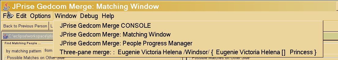 There will be a Three-pane merge item in the Window Menu for each Three-Pane Merge Window that is currently active. The name of the individual for whom the Three Pane Merge window was defined will be displayed as well. This will open the Three-Pane Merge Window and bring it to the top.